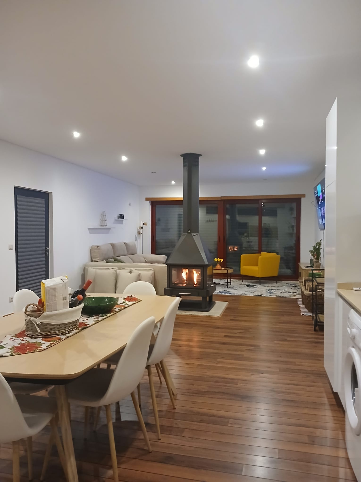 A cozinha americana totalmente equipada é um verdadeiro ponto alto, com todos os eletrodomésticos necessários: frigorífico, máquina de lavar, forno, máquina de lavar louça, microondas, máquina de café, torradeira e chaleira. Perfeita para preparar refeições em família ou para grupos de amigos.