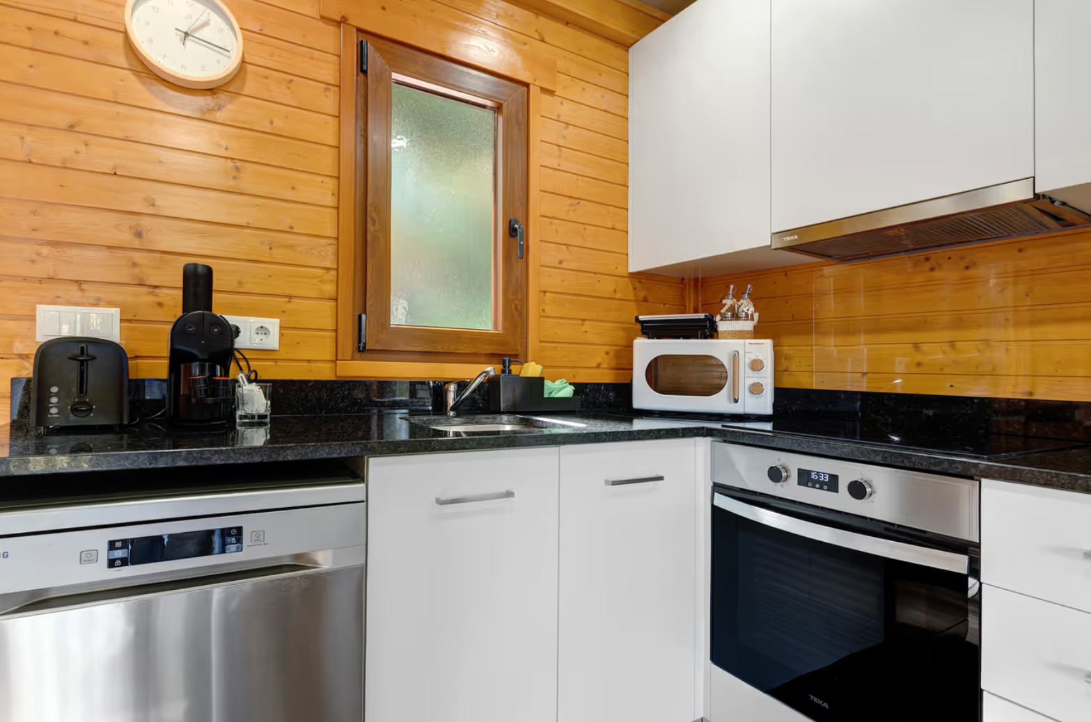 The fully equipped American kitchen is a true highlight of the property. It has all the essential appliances: fridge with freezer, coffee machine, oven, dishwasher, microwave, toaster and kettle. Preparing meals with family or friends will be a moment of pure joy and sharing.
